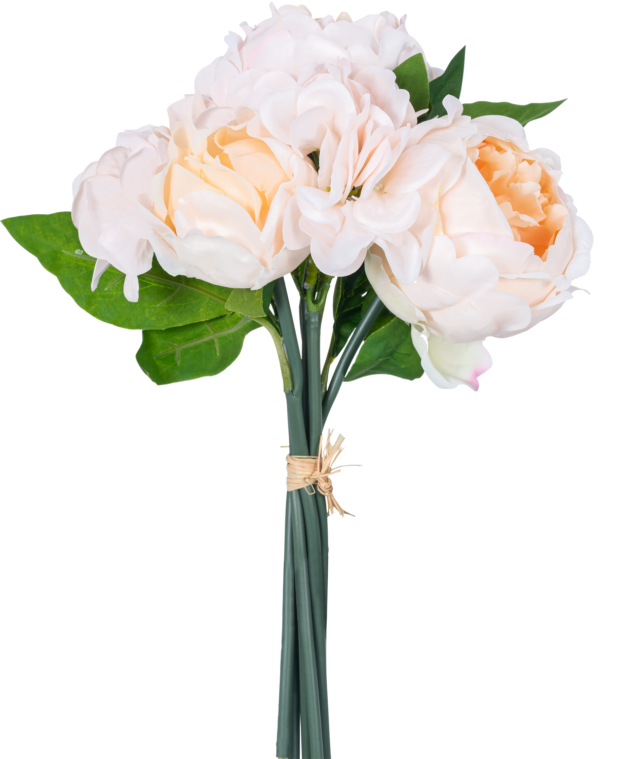 Questo piccolo bouquet è composto da un mix di peonie, ortensie e boccioli di loto.