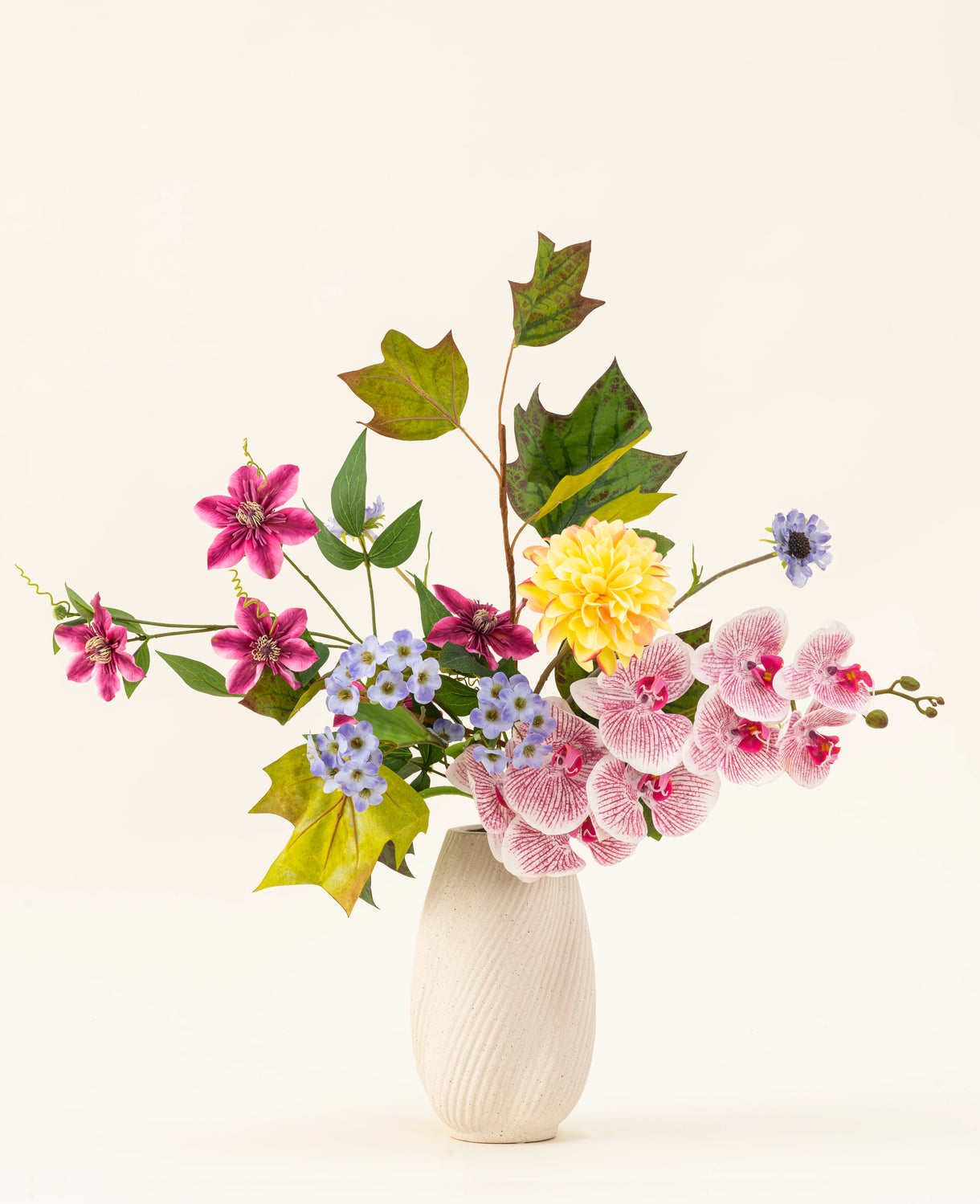 Il doppio di clematide colorato e il vero tocco di orchidea in fucsia e viola forniscono un sorprendente contrasto di colore, mentre il vero tocco di Dahlia in champagne è una controparte morbida e luminosa. Le generose foglia di tulipano e rami di felce portano la profondità e la struttura naturali...