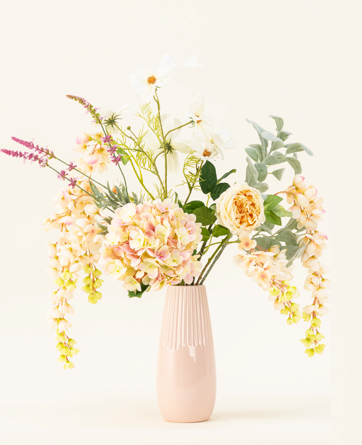 Morbida, sognante ed elegante: il bouquet di seta che arrossisce la bellezza fa il nome di tutto l'onore. Con un arioso mix di crema, bianco, giallo morbido e viola, questo bouquet irradia romanticismo e raffinatezza. Ideale per coloro a cui piace il lusso sottile e un'atmosfera leggera e rilassante in casa.