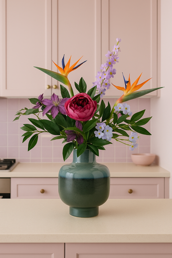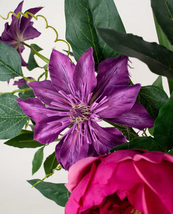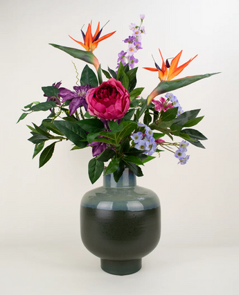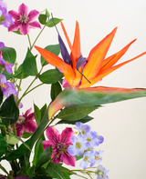La composizione è una festa per gli occhi, tra cui l'elegante peonia, l'orchide esotica in intenso viola e la spettacolare Strelitzia. La generosa clematide, sia a singolo che a doppio potere, fornisce profondità e volume, mentre il Delphinium e la foglia di baia verde fresca finiscono il tutto magnificamente.