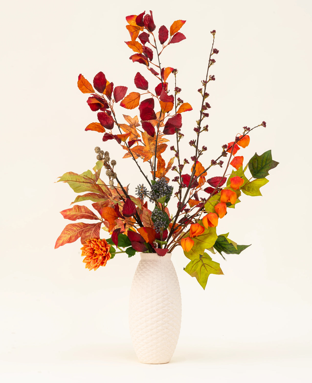 Il fascino di castagno dà vita ai ricchi colori e trame dell'autunno in un elegante bouquet di seta. Con toni rossi e arancioni profondi, foglie robuste e strutture giocose di bacche, questa disposizione evoca la sensazione di una passeggiata forestale nel sole di ottobre. Un pezzo potente ma raffinato che aggiunge calore e carattere a ogni stanza, senza dominare.