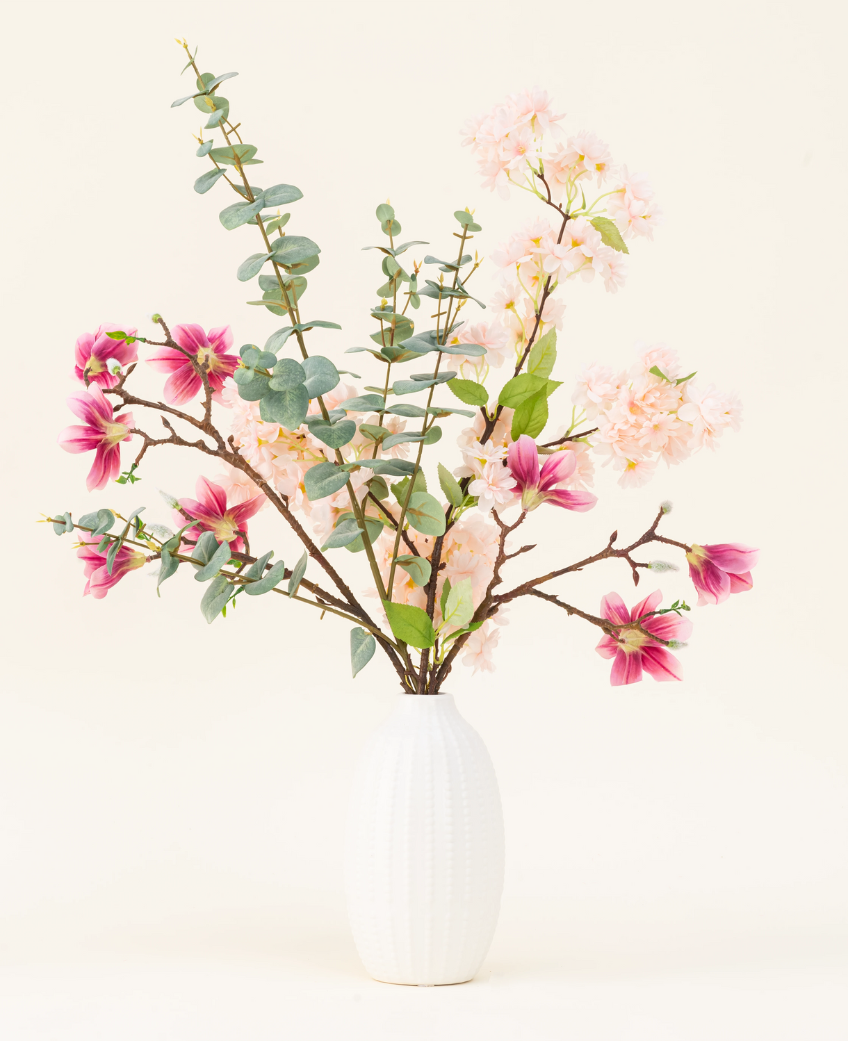 Porta un tocco di raffinatezza e tranquillità in casa con i fiori di piume artificiali di seta. Questo bouquet elegantemente composito è costituito da tre rami accuratamente selezionati: la bellezza senza tempo della magnolia, la morbidezza fresca della foglia di eucalipto e il tocco romantico di fiori di ciliegio rosa chiaro.