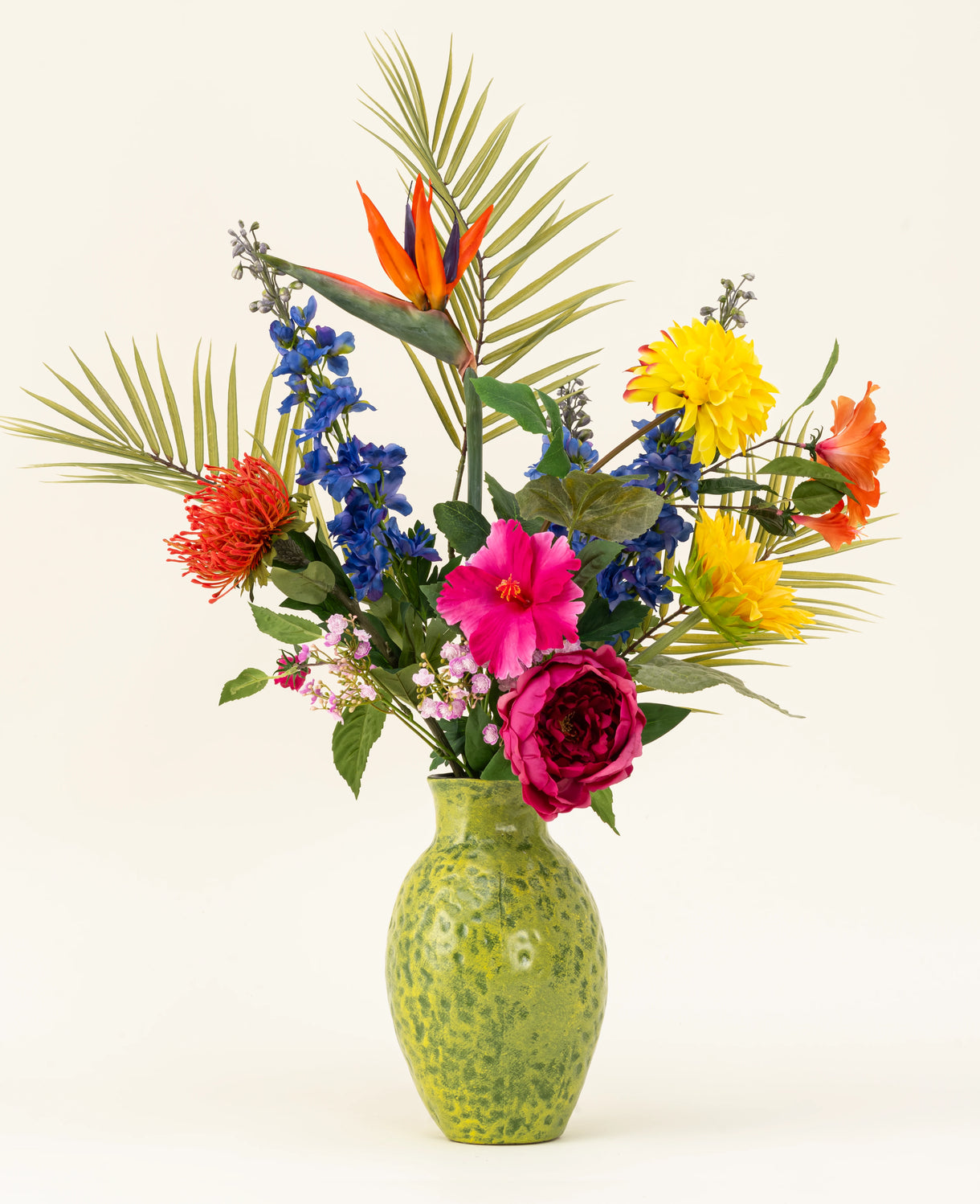 🌺 esotico, espressivo e scintillante - Hibiscus Fiesta è un'esplosione di colore e carattere. Questo bouquet di seta porta l'energia di una festa tropicale direttamente nell'interno. L'ibisco infuocato in arancione e rosa forma il cuore del bouquet, tremante di allegria e talento.