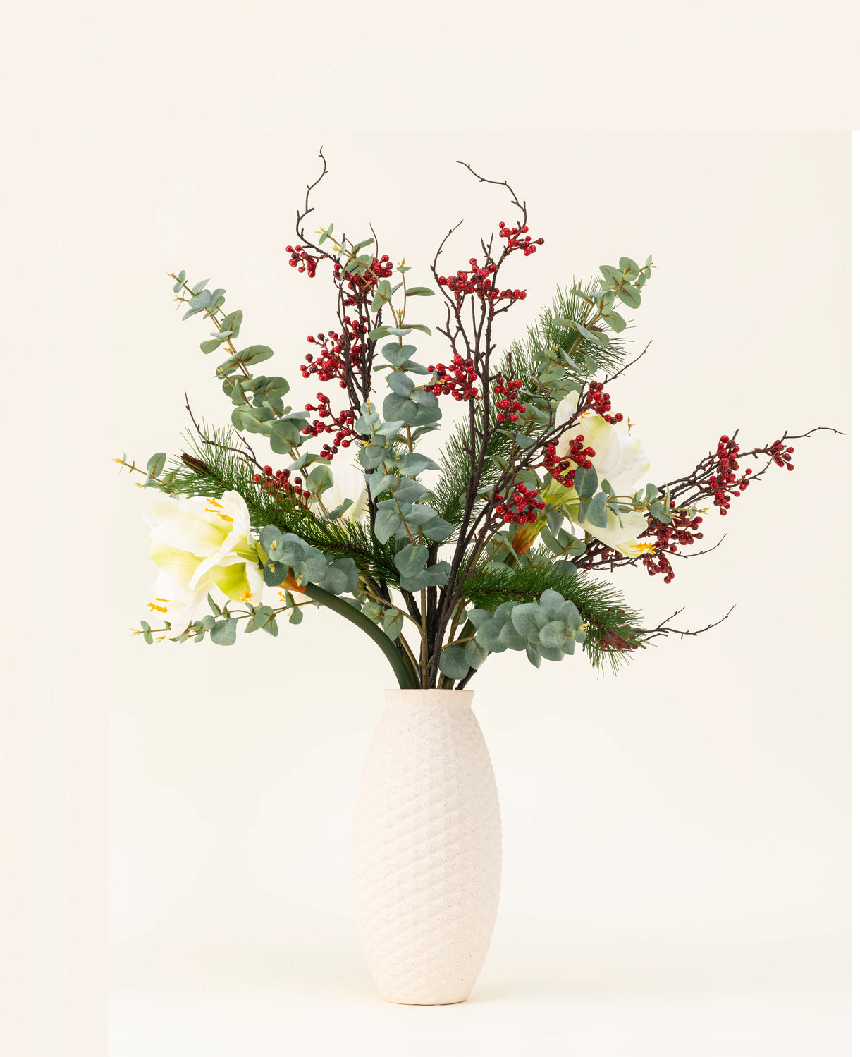 L'amaryllis bianco è il centrotavola sereno e conferisce al bouquet un aspetto puro ed elegante. Le bacche rosse aggiungono una nota festosa e vibrante, mentre il ramo di pino fornisce una profondità naturale e una base robusta. L'eucalipto rifinisce con freschezza e un...